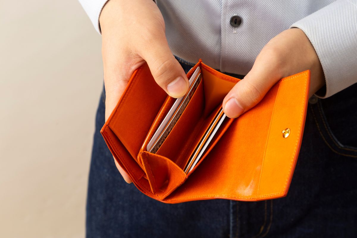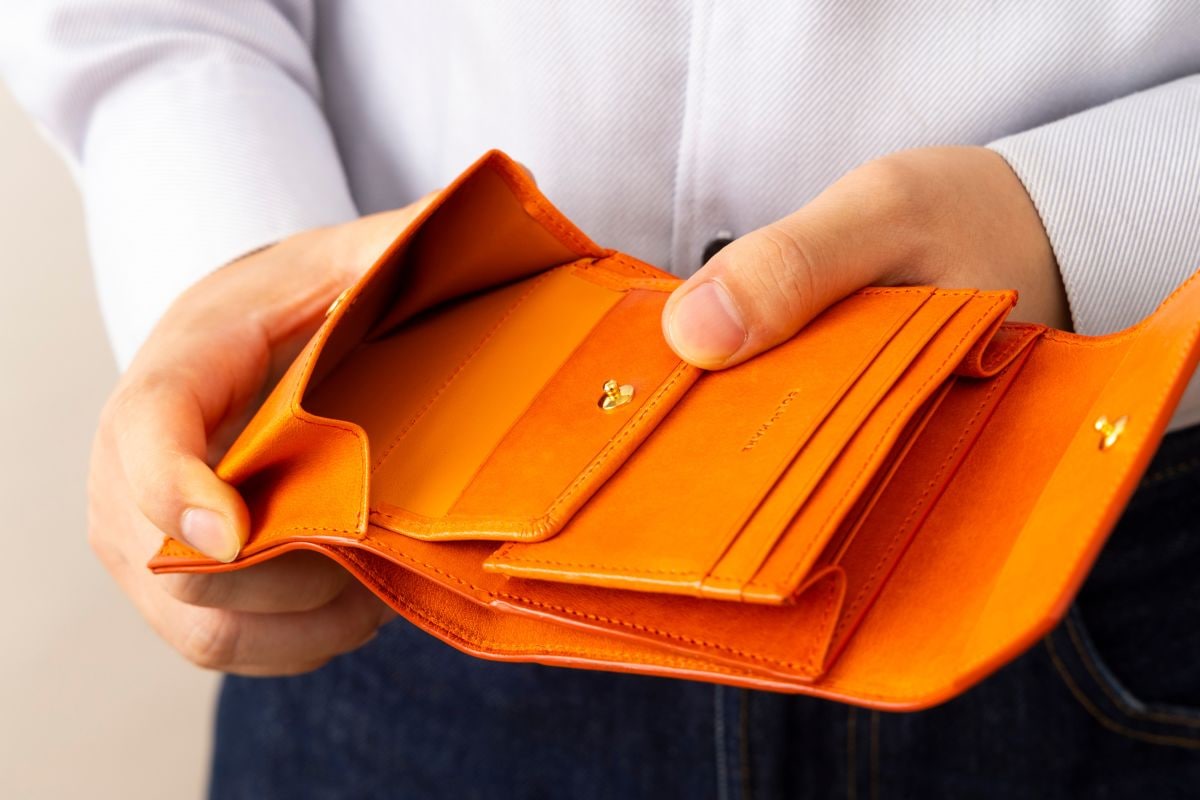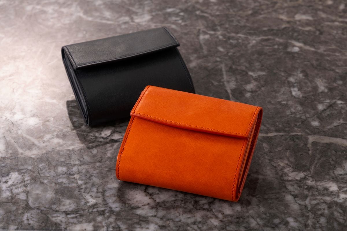 • ネイビーブルーにはブラックニッケル、オレンジにはゴールドの金具を使用し財布をより一層引き立てます。カード裏などの見えない部分には国産牛革スムースを使用。オールレザーで贅沢に仕上げました。
